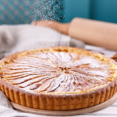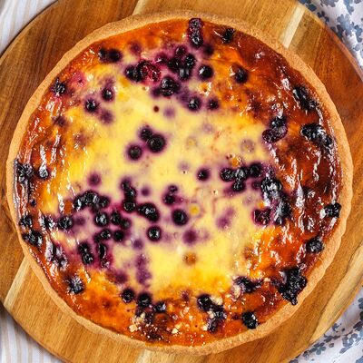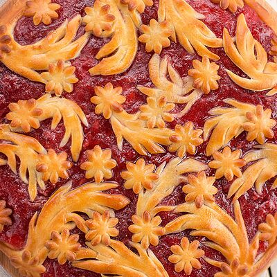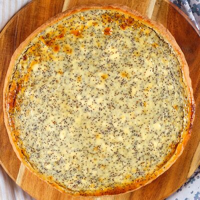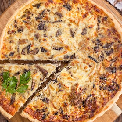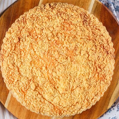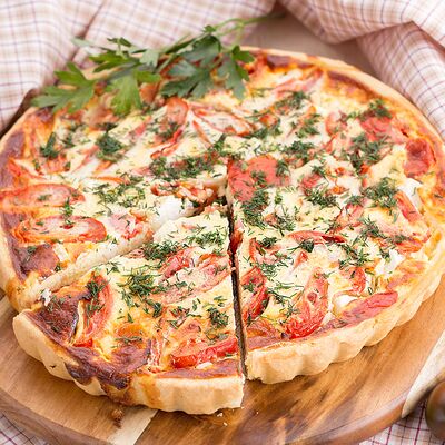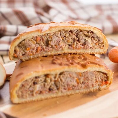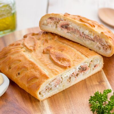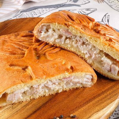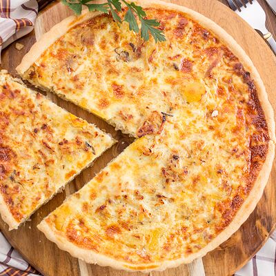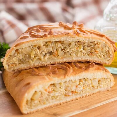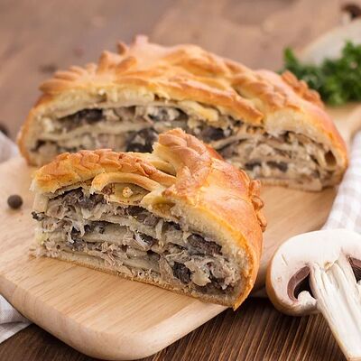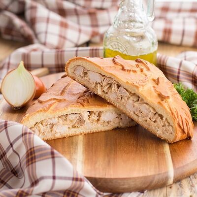 Куриное филе с картофелем и луком, запечённое в сливочно-яичном соусе. Песочное тесто