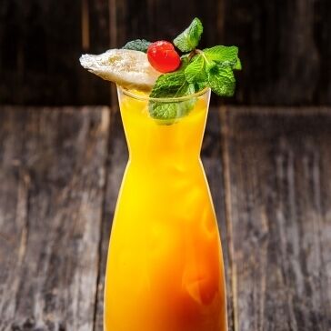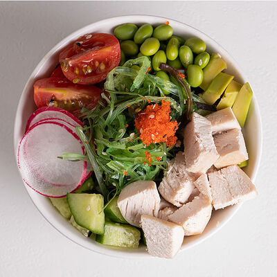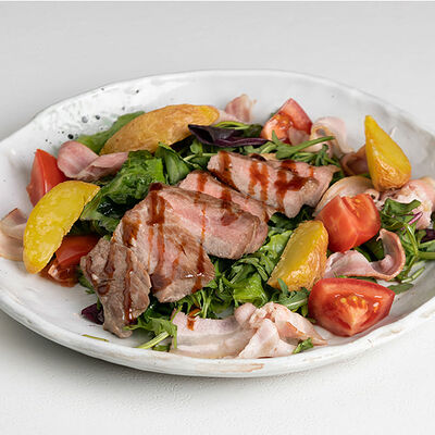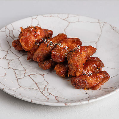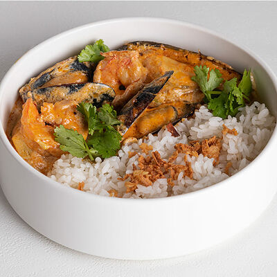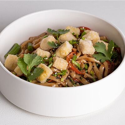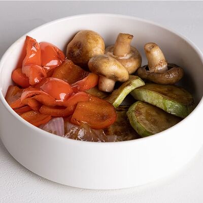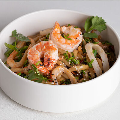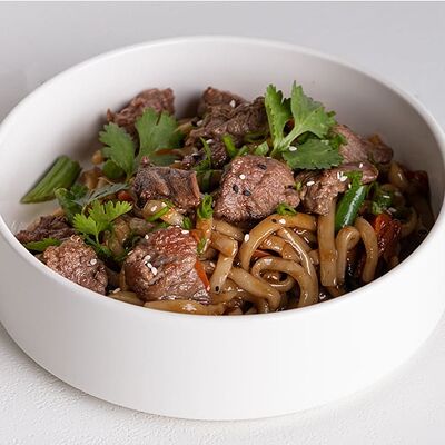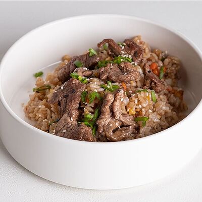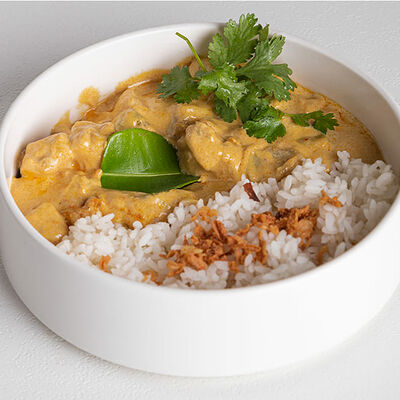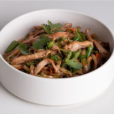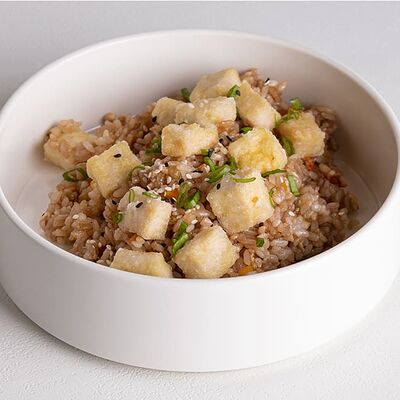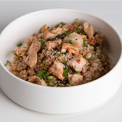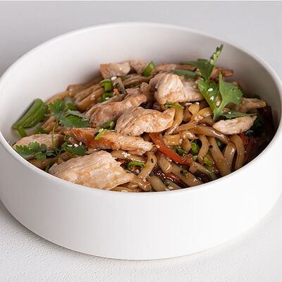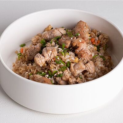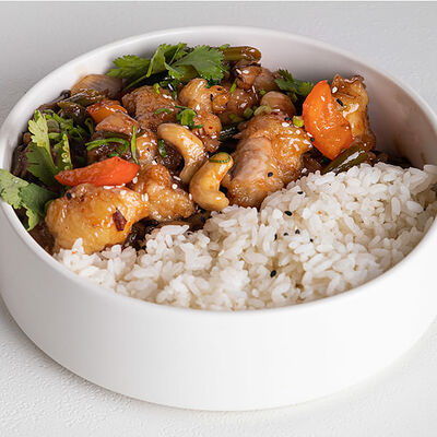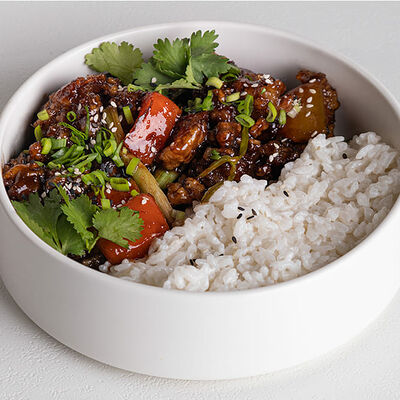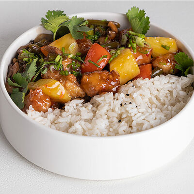 Свинина, перец болгарский, цукини, ананас, острый перец, кисло-сладкий соус, кинза, чеснок, рис