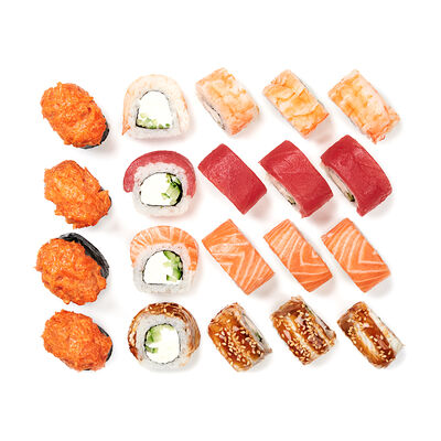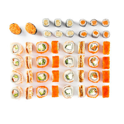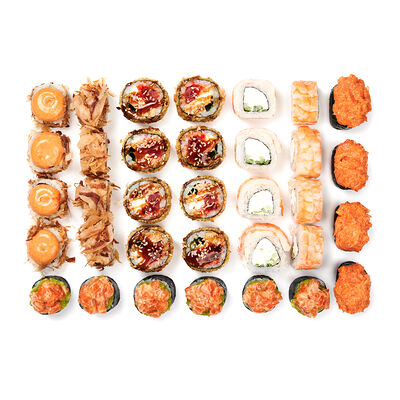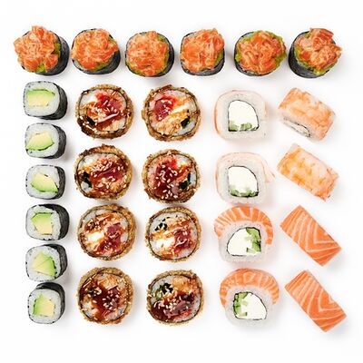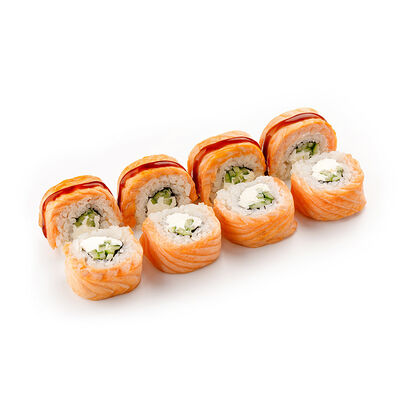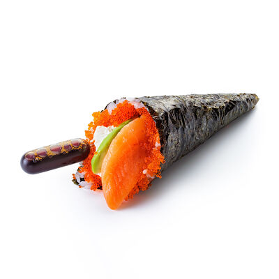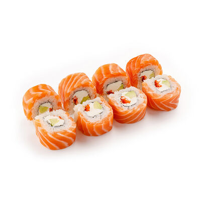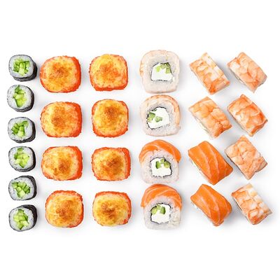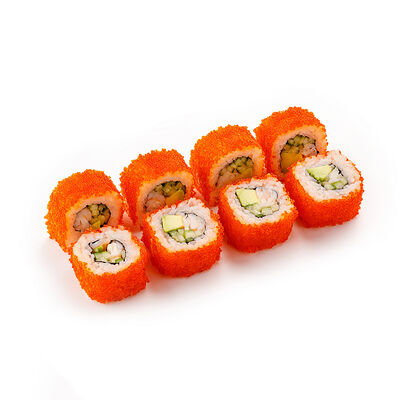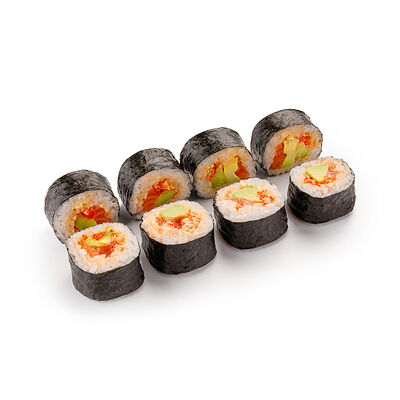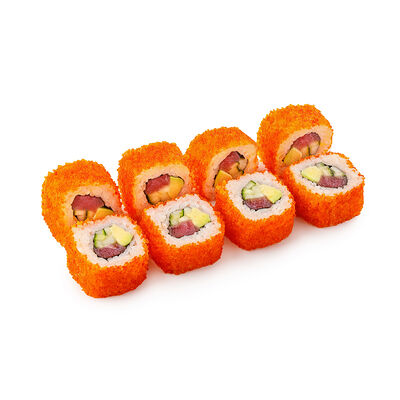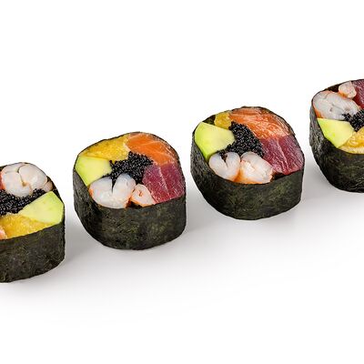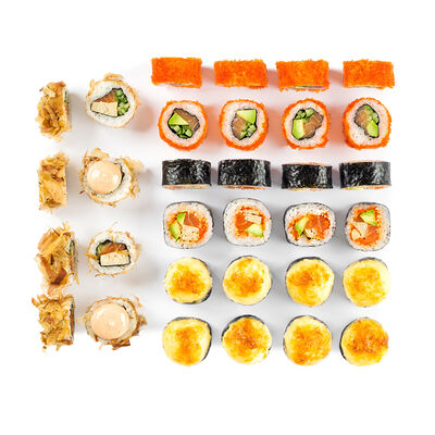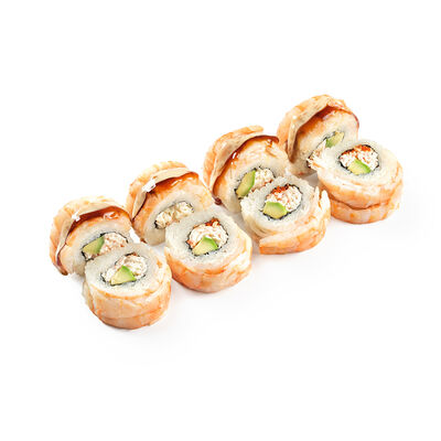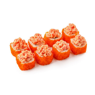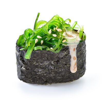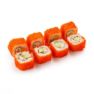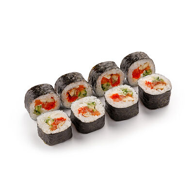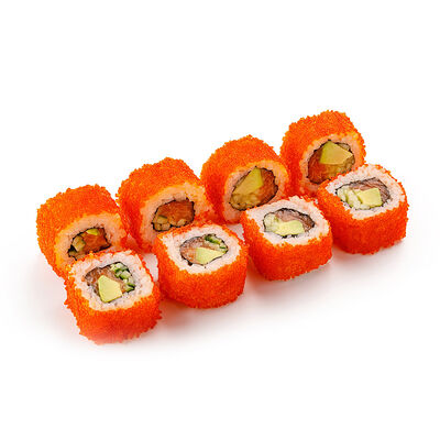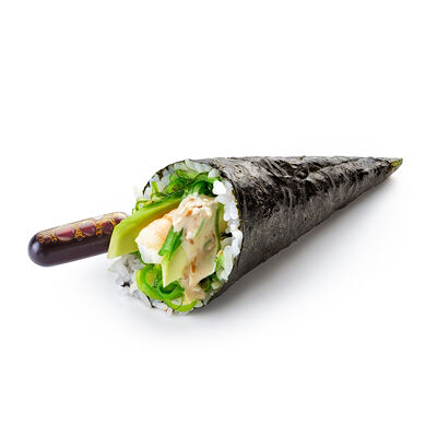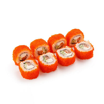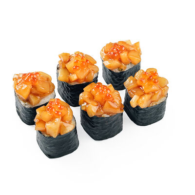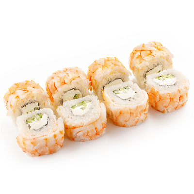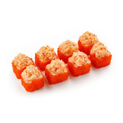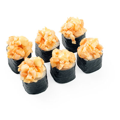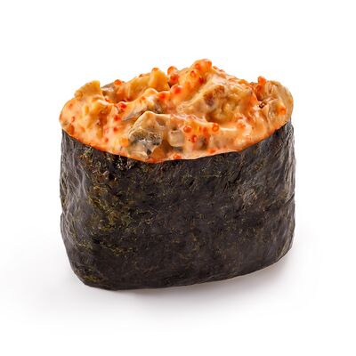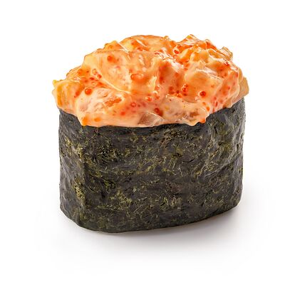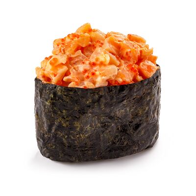 Нори, сливочный сыр, рис, икра, спайси соус, креветка, имбирь, васаби, соевый соус