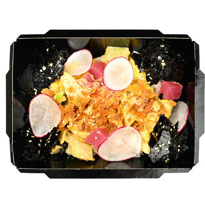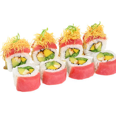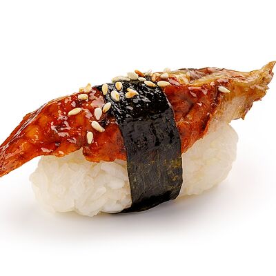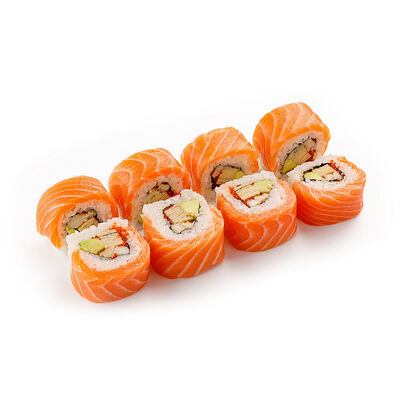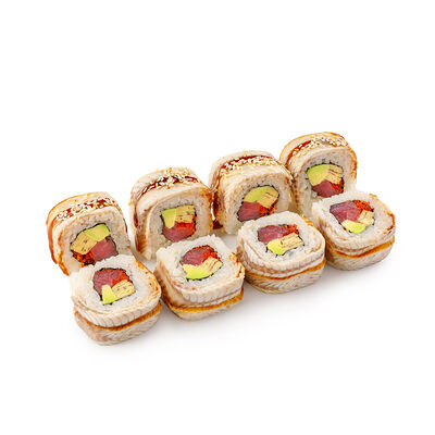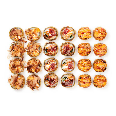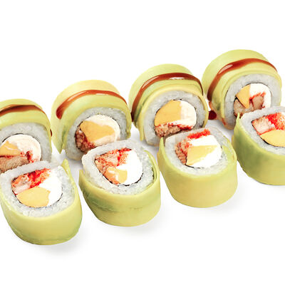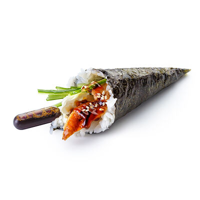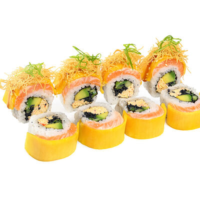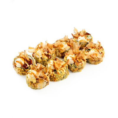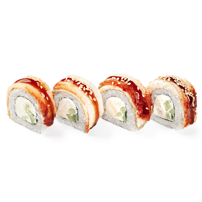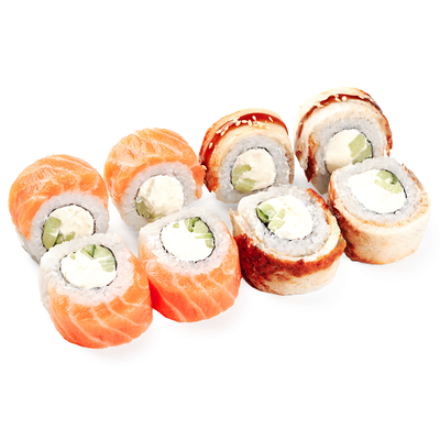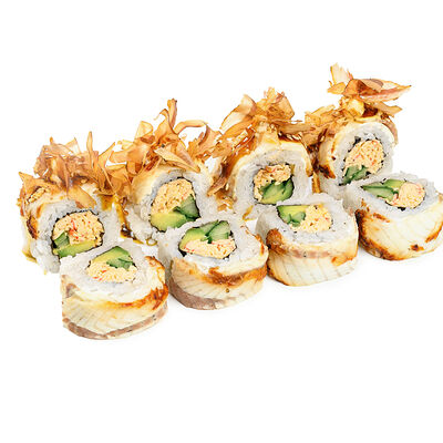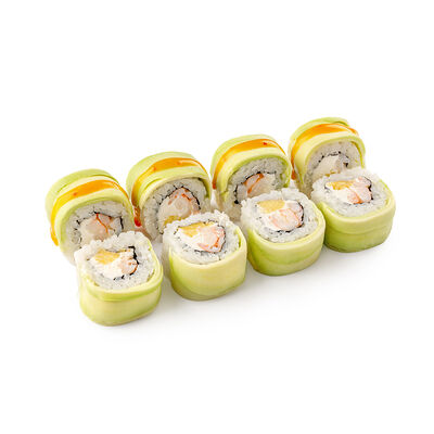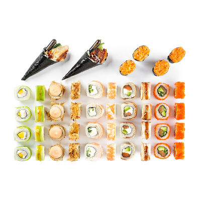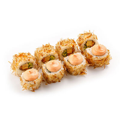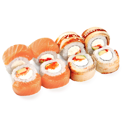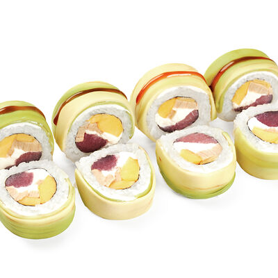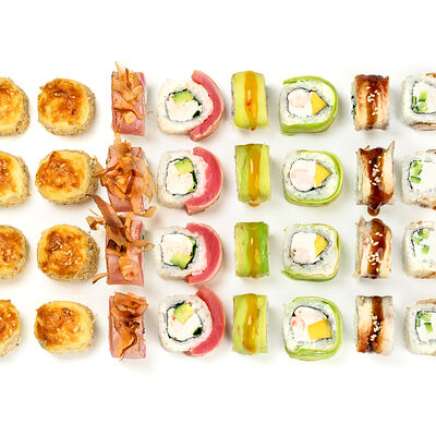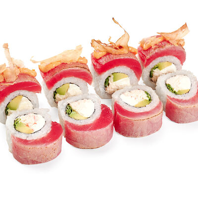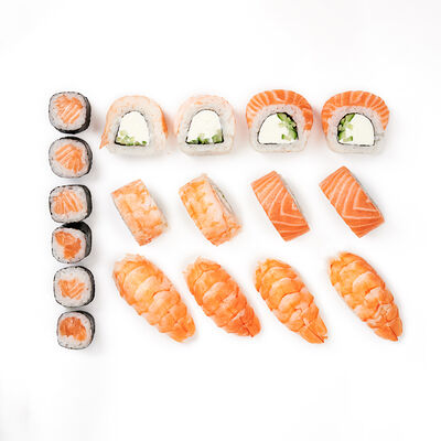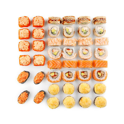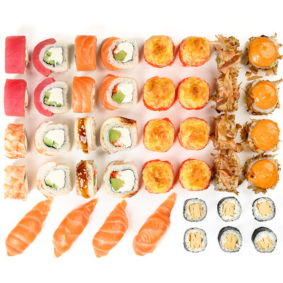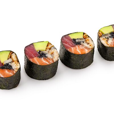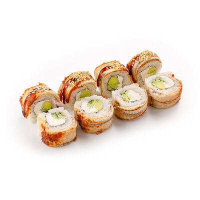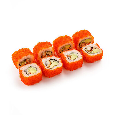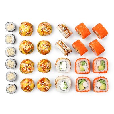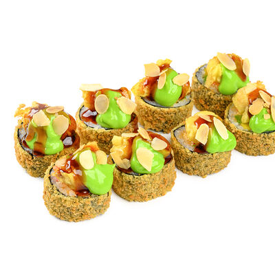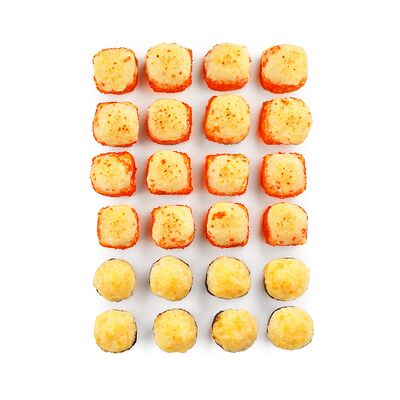 Нори, сливочный сыр, рис, икра, спайси соус, креветка, имбирь, васаби, соевый соус