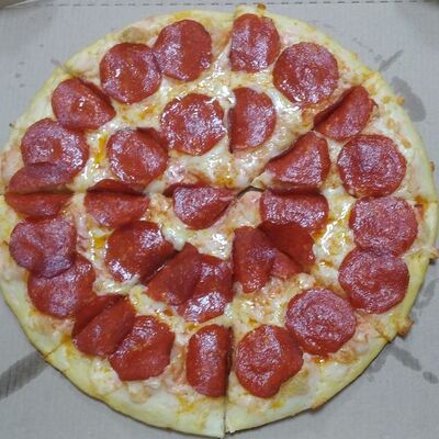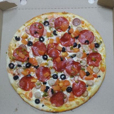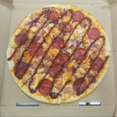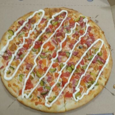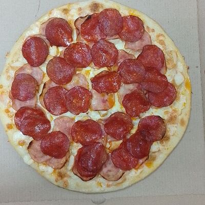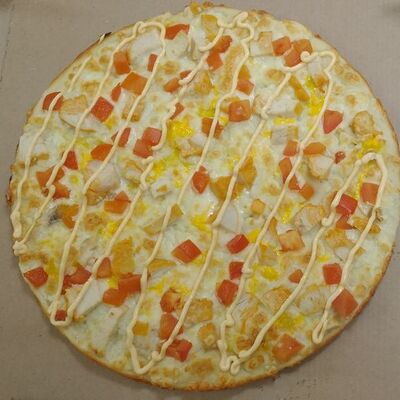 Пшеничная лепешка, сыр моцарелла, филе грудки цыплёнка, колбаски пепперони, томаты, соус для мяса