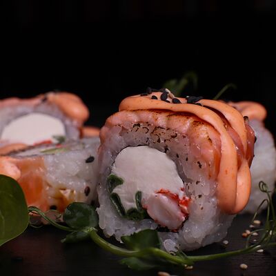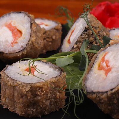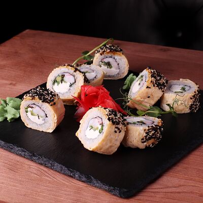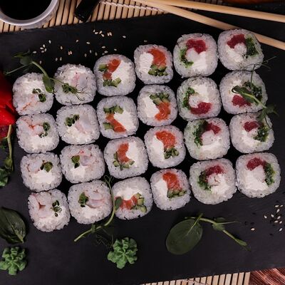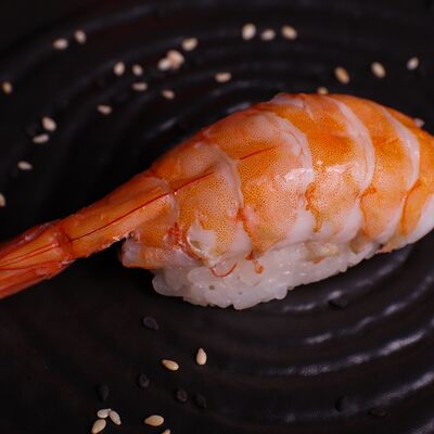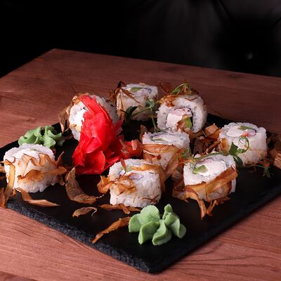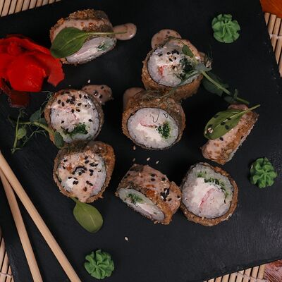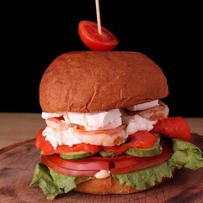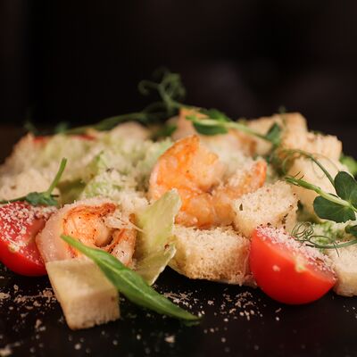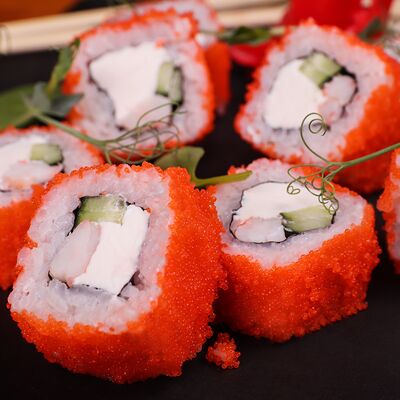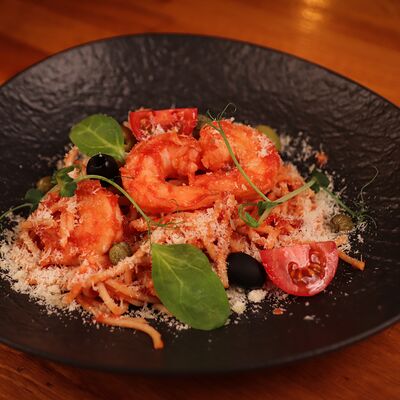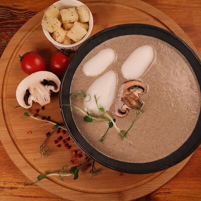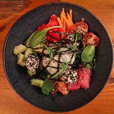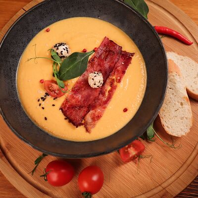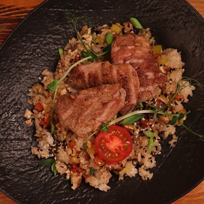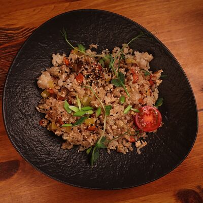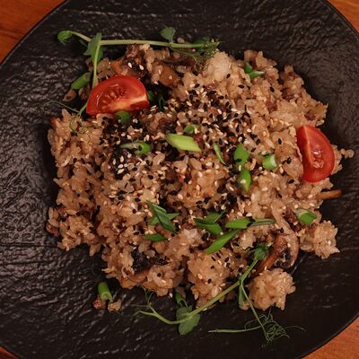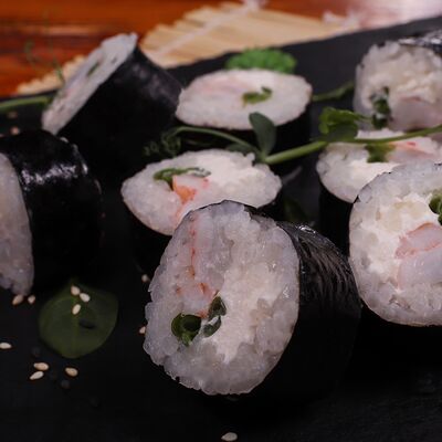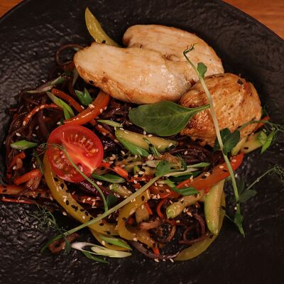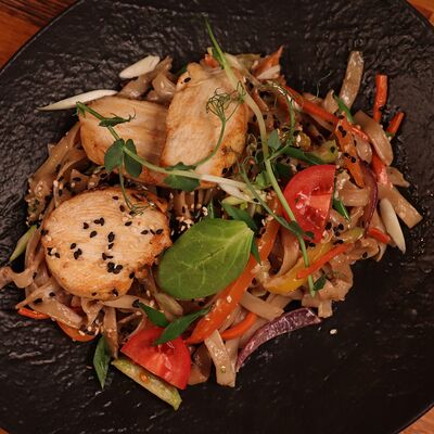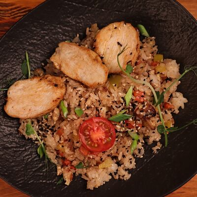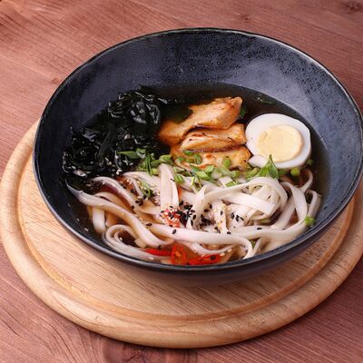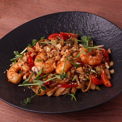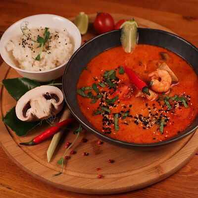 Бульон том ям, кокосовое молоко, креветка тигровая, шампиньоны, куриное филе, томаты черри, кинза, кунжут, рис, лайм