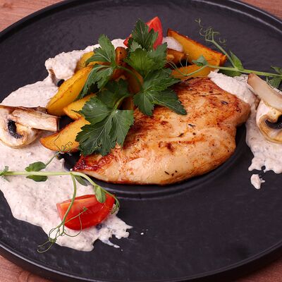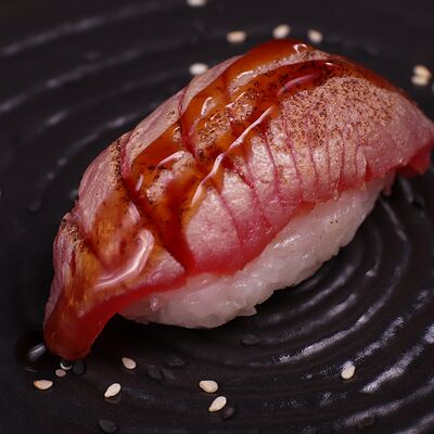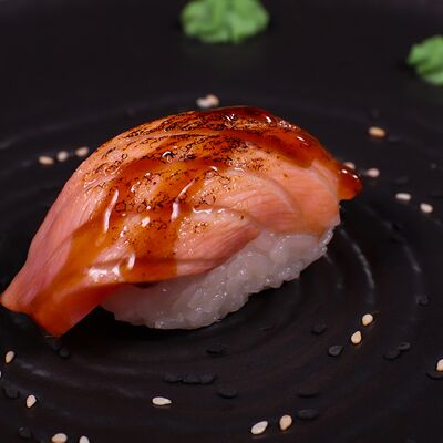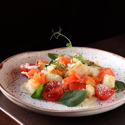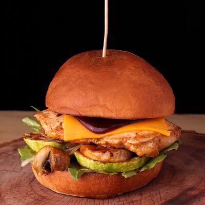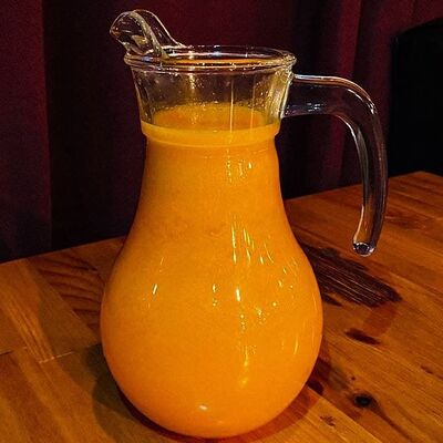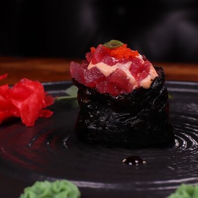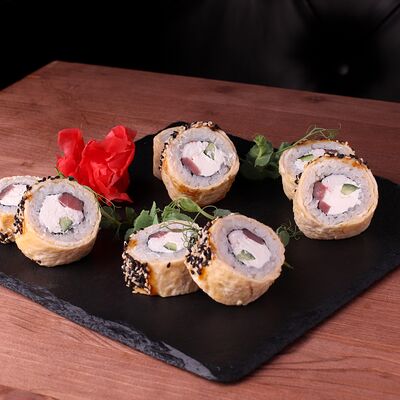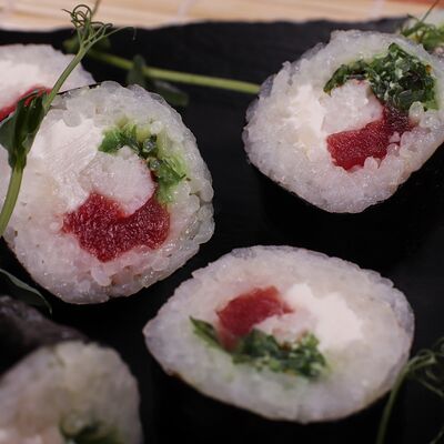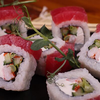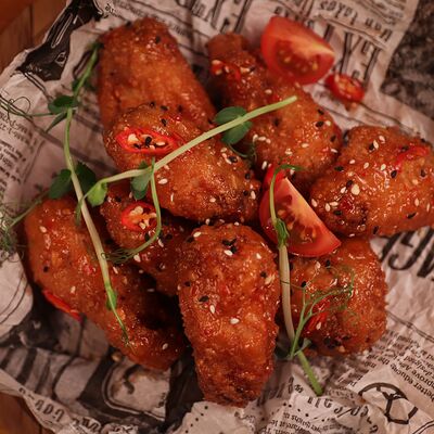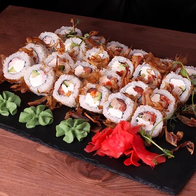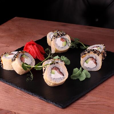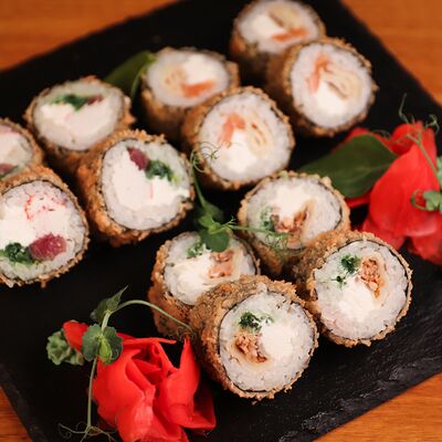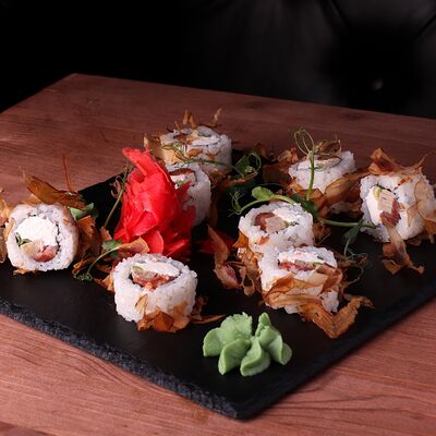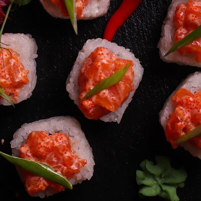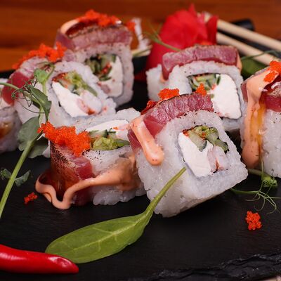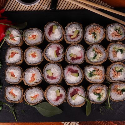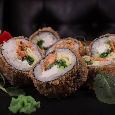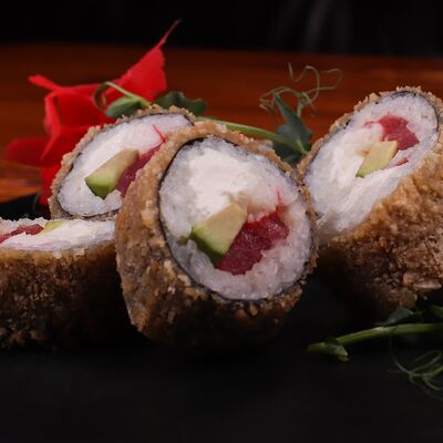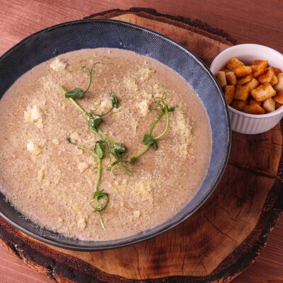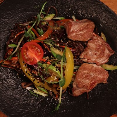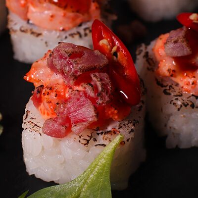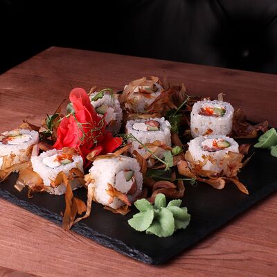 Бульон том ям, кокосовое молоко, креветка тигровая, шампиньоны, куриное филе, томаты черри, кинза, кунжут, рис, лайм