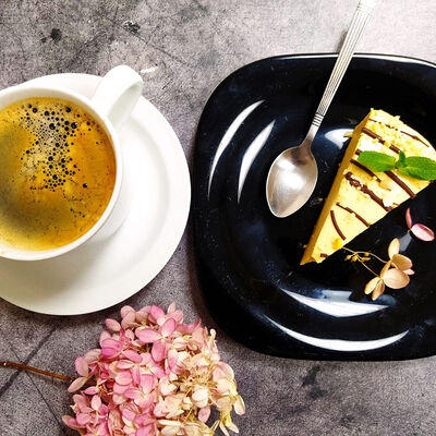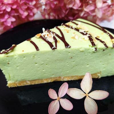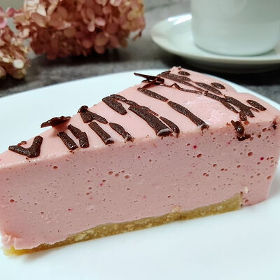 Нежный малиновый чизкейк собственного приготовления с творожным сыром, сливочным маслом, свежей малиной, сахаром, печеньем (пшеничная мука, растительное масло, сахар, вода)