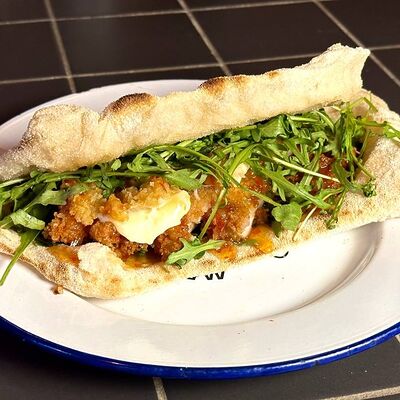 Курица, сыр, капуста кимчи, лук маринованный, соус карривурст