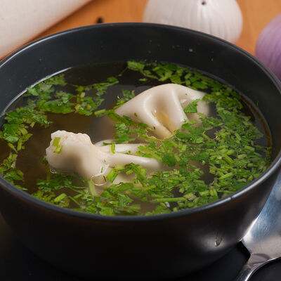 Наваристый куриный бульон с хинкали из курицы, посыпанные свежей зеленью