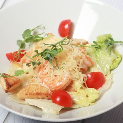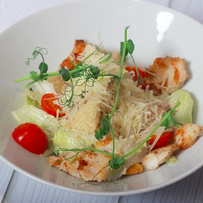 Пшеничная лепешка, куриное филе, свежий салат, томаты, сыр пармезан, соус цезарь