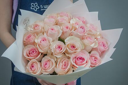 Состав букета: Розы розовые (25 шт.), атласная лента (1 шт.). Цвет: розовый. Диаметр бутона: 12-15 см. Количество лепестков: 40-50. Высота стебля: 50-90 см. Стойкость в вазе: 14 дней