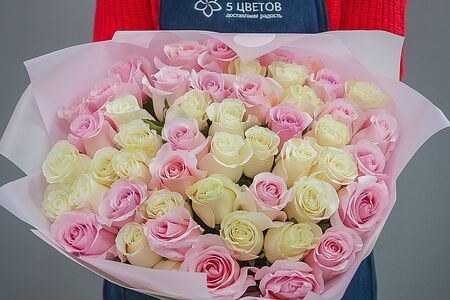 Состав: Роза белая - 25 шт. Роза розовая - 26 шт. Матовая пленка. Атласная лента.