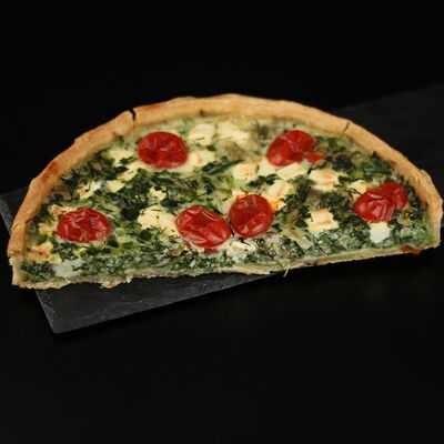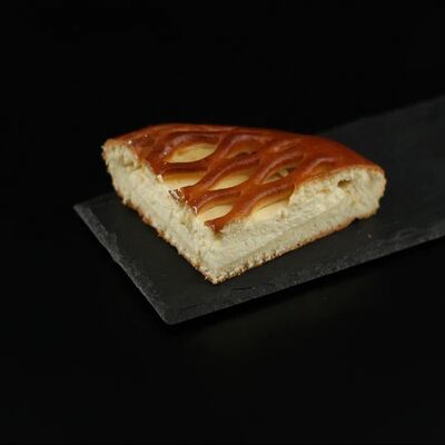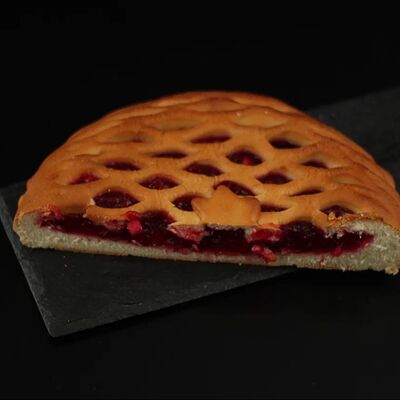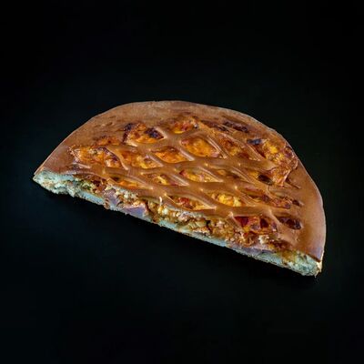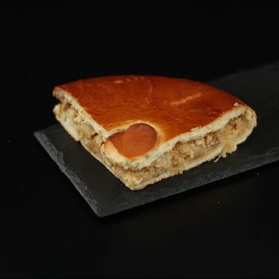 Половинка пирога из сдобного теста с большим количеством начинки из мяса говядины и свинины с добавлением лука и специй