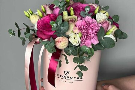 Прекрасный авторский букет в коробке, созданный из роз, гвоздик, эвкалипта и лизиантуса, принесет в ваш дом атмосферу праздника и уюта. Этот букет станет идеальным подарком для близких и друзей, добавив нотку красоты в их интерьер. Уникальное сочетание цветов и зелени создаст уютную атмосферу в любом помещении.