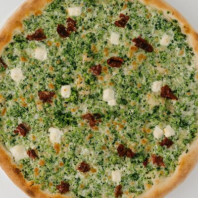 Пицца на тонком тесте. Сыр моцарелла, сыр фета, брокколи, шпинат, сицилийские вяленые томаты, сливки
