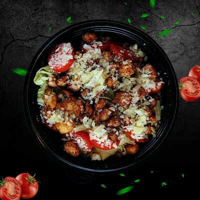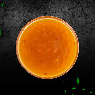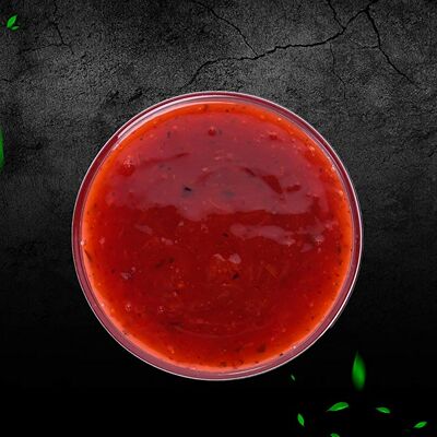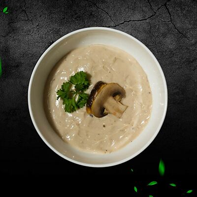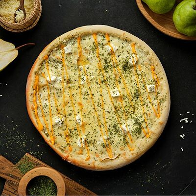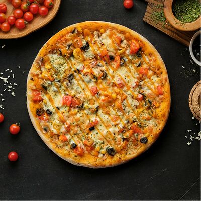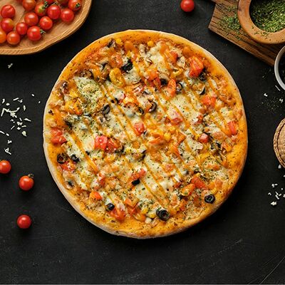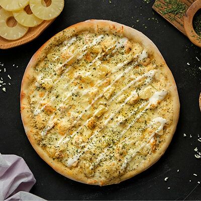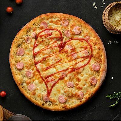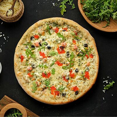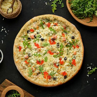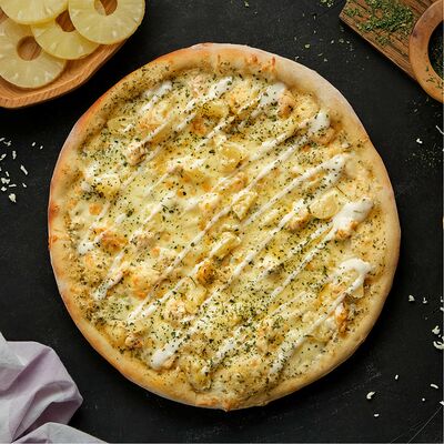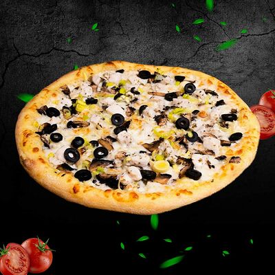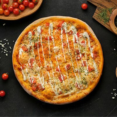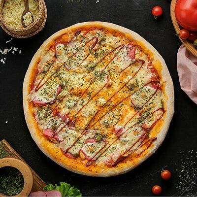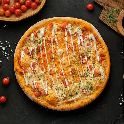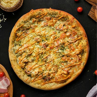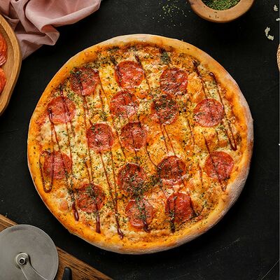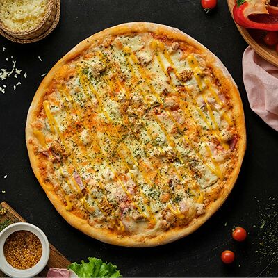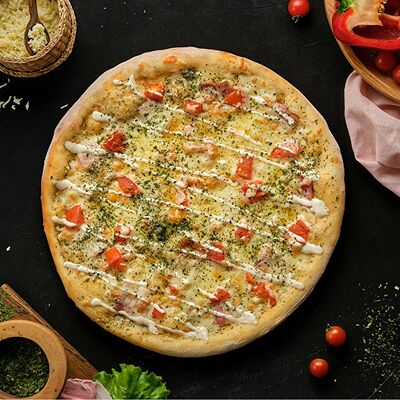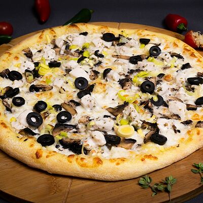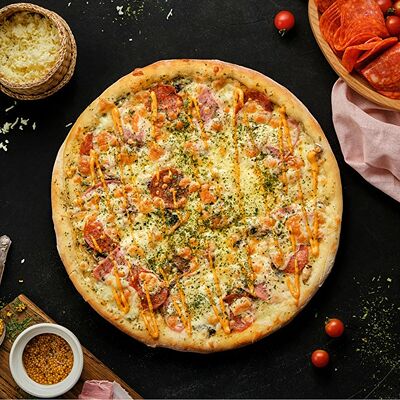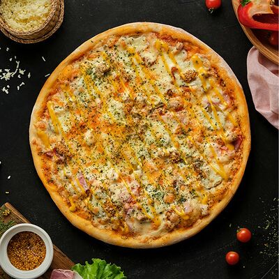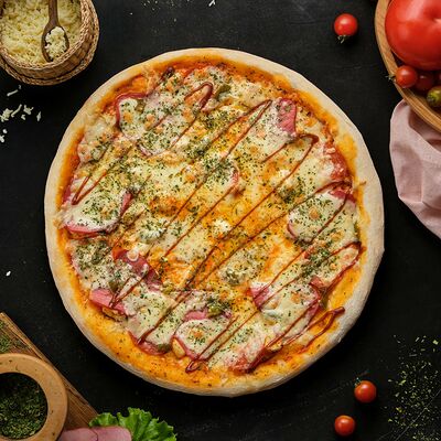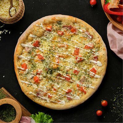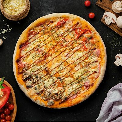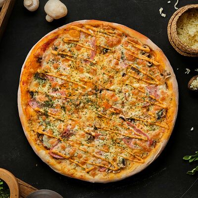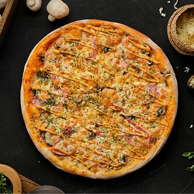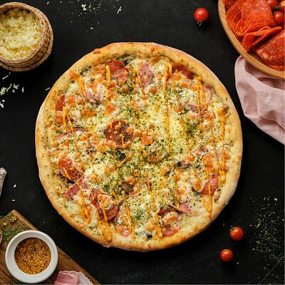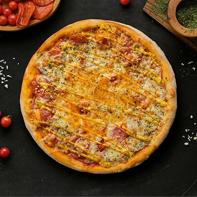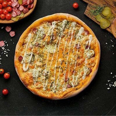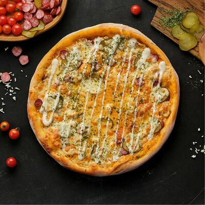 Основа из сливочного соуса Ранч, пепперони, ветчина, шампиньоны, соус Гриль, сыр Моцарелла
