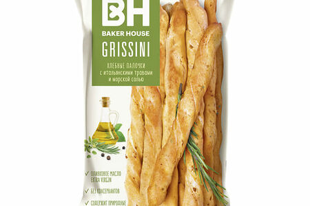 Grissini родом из Италии, много веков назад, появились в окрестностях Турина. Сегодня являются традиционной закуской и неотъемлемой частью ассортимента итальянских ресторанов и пиццерий. Хрустящие палочки Baker House размером около 15 см или чуть больше пропитаны оливковым маслом первого отжима Extra Virgin и целым букетом специй от базилика до шалфея. Ярко чувствуется чеснок, что придает им особую пикантность. По текстуре они совершенно не жесткие, благодаря качественным ингредиентам и удобной упаковке, которая бережно сохраняет продукт.