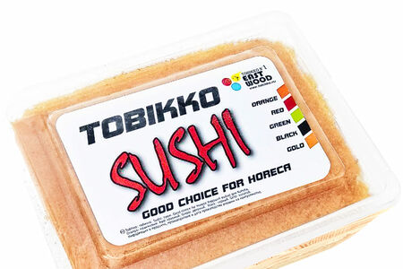 Икорное рыбное изделие: икра летучей рыбы пятнистый стрижехвост пробойная, соленая, замороженная, окрашенная «Тобико суши» золотая – лучший выбор для суши и роллов. Красивый цвет икры тобико и маленькие размеры икринок около 0,5-0,8 мм отлично подходят для украшения блюд. Она придает им аутентичный азиатский вкус. Икра летучей рыбы известна своим оригинальным солоноватым послевкусием с легкой копченой ноткой.