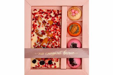 Белый шоколад с клубничным драже, украшенный амарантом в золотом кандурине; Апельсиновый шоколад с зернышком миндаля, украшенный семенами чиа в золотом кандурине; Конфеты из клубничного шоколада с сушеными ягодами клюквы и семенами чиа в золотом кандурине (2 шт.). Содержит молоко, сою. Возможны следы продуктов, вызывающих аллергию. Пищевая ценность (100 г): белки - 7,5 г, жиры - 36,0 г, углеводы - 49,3 г. Энергетическая ценность: 552 ккал (2309 кДж)