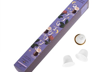 100% арабика, ароматизатор. Обжарка: сильная. Интенсивность: 5. Срок годности: 18 месяцев. Количество: 10 капсул по 5 г