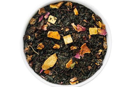 Чёрный чай, изюм, гибискус, кусочки сладкого яблока, вишня, шиповник, цедра апельсина, лепестки розы