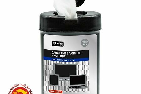 Салфетки влажные Attache Selection для экранов (100 штук в тубе).В рамках тестового периода производится смена упаковки с сохранением всех потребительских характеристик товара. На переходный период допускается поставка данной продукции в двух вариантах дизайна упаковки. Влажные салфетки Attache Selection LCD&TFT предназначены для ухода и очистки экранов мониторов, экранов и пластиковых поверхностей ноутбуков, нетбуков и планшетных компьютеров. Эффективно удаляет грязь, пыль и отпечатки пальцев. Не оставляют разводов и ворса. Устраняют электростатические заряды, в составе присутствует антистатический компонент. Компактный размер упаковки. После распаковки следует вытягивать салфетки из центра для вставки в крышку.Рекомендуем протирать сухой салфеткой после влажной салфетки во избежание разводов.