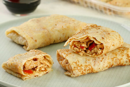 Необычное сочетание! Наш бренд-шеф мастерски соединил русскую и азиатскую кухню – придумал для блинчиков оригинальную начинку из курицы с соусом терияки. Куриную разделку привозим с Завода МясновЪ, а тесто для блинчиков делаем на основе нашего молока с Молзавода МясновЪ Хлевное. Добавляем яйца, пшеничную муку, подсолнечное масло, сахар и соль – всё из наших же продуктов, которые можно купить в магазинах КуулКлевер. Обжариваем блинчики на французской блиннице с двух сторон, прямо как дома на сковороде. Вот почему у наших блинчиков такой домашний вкус!