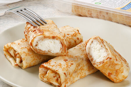 Румяные, равномерно пропечённые блинчики с творогом МясновЪ ФЕРМА. Тонкое, нежное тесто и много начинки - идеальное сочетание. В упаковке 3 блинчика. Готовы к употреблению – разогрейте и наслаждайтесь!