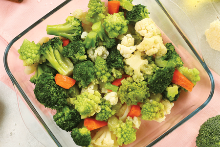 Овощное рагу из 3-х видов капусты — это сбалансированная, яркая и безусловно полезная овощная смесь. Брокколи, цветная капуста и капуста романеско разделаны на одинаковые соцветия, чтобы все равномерно приготовилось и правильно раскрыло вкус. Рагу полностью готово к тушению: в него уже добавлено оливковое масло, осталось только посолить и поперчить по вкусу.