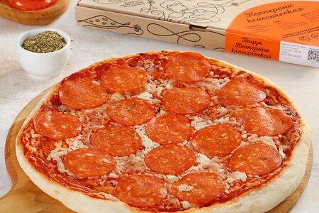 Итальянская пицца за 5 минут! Основа пиццы – мука, привезенная прямо из Италии, чтобы добиться нужной воздушности теста и хруста корочки. Тесто готовим по рецептам лучших пиццайолло 24 часа: после замешивания мы убираем его в камеру для ферментации. Оно становится легким и приобретает насыщенный вкус и аромат. Долгое созревание не требует добавления большого количества дрожжей – этого ингредиента в составе нашей пиццы менее 1%. Классическая начинка по рецептам лучших итальянских пиццайоло: соус из протёртых томатов, пикантная колбаска Пепперони, смесь ароматных итальянских трав.