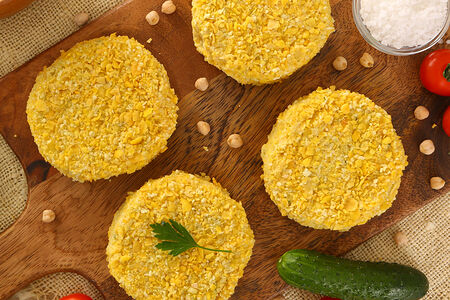 К нему мы добавили нут, богатый белком, зелень и панировку из кукурузной крупы для плотной формы и аппетитной корочки при обжарке.