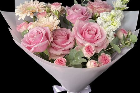 Сведения о составе: Роза Аваланш Пинк 55 см - 5 Маттиола - 2 Гербера мини - 3 Фисташка (банч) - 0,5 Роза Кейт-Линн 55 см - 3 Эвкалипт Цинерия (банч) - 0,25 Упаковка Лента