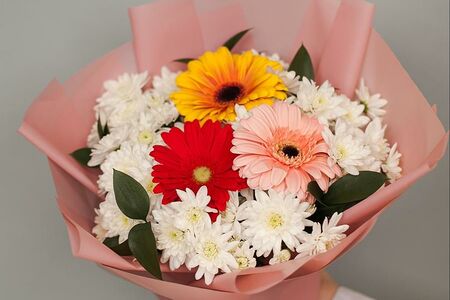 Сведения о составе: Гербера - 3 Хризантема кустовая - 5 Рускус Израиль - 5 Упаковка Лента атласная
