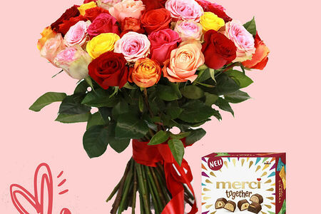 КОМБО 51 роза микс Эквадор + коробка шоколадных конфет Merci together доставка
