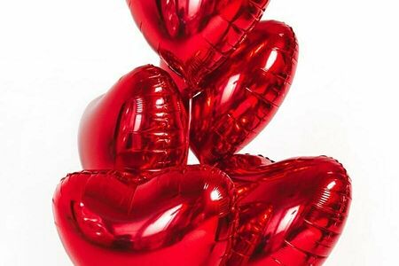 Фонтан из шаров надутых гелием, установлен на грузик и состоит из: 5-ти фольгированных сердец размером 45 см.