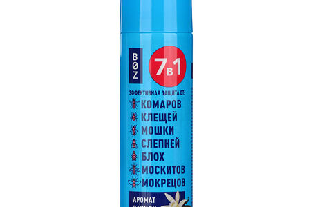 Аэрозоль-репеллент 7 в 1 BOZ объемом 150 мл – это защитный спрей с широким спектром действия. Эффективно защищает от укусов комаров, клещей, мошек, москитов, слепней, блох и мокрецов. Незаменим во время отдыха на природе и на даче, для кемпинга, походов и рыбалки. Имеет приятный аромат ванили, который отпугивает насекомых. Обладает длительным действием при распылении на одежду и ткани.