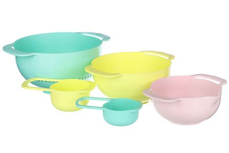 Набор для кухни 5 в 1 станет важным дополнением вашей кухни, ведь комплект способен помочь вам точно отмерять необходимое количество муки, специй и других ингредиентов. Набор состоит из 5 пластиковых приборов, среди которых вы сможете найти 2 миски для смешивания 1,2 л; 0,8 л , дуршлаг диаметром 22 см и две мерные чашки объемом 0,25 л и 0,125 л. Стоит отметить, что все предметы набора вставляются друг в друга для компактного хранения.