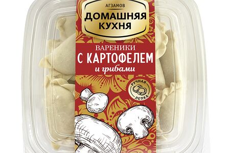 Тонкое домашнее тесто и сочная картофельная начинка с добавлением грибов. Домашние вареники ручной лепки по фирменному рецепту Рената Агзамова. Вся продукция лепится вручную