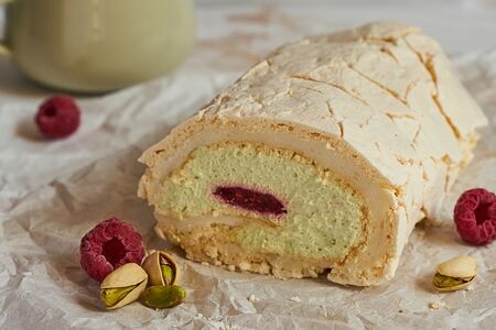 Рулет из воздушной, лёгкой хрустящей меренги с прослойкой из нежного фисташкового крема и протертой с сахаром малины. Остаточный срок годности не менее 36 часов. ТМ Народный кондитер