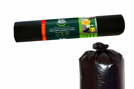 Пакеты для мусора Master FRESH серия Cуперпрочные изготавливаются из 100% переработанного вторично полиэтилена. Пакеты для мусора Master FRESH Суперпрочные большого литража и обладают высокой прочностью. При отрыве пакет легко отделяется от рулона и равномерно распределяет груз мусора. Пакеты отлично защищают от грязи и неприятного запаха, препятствуют проникновению насекомых. Идеально подходят для: больших бачков, генеральной уборки, дачных работ, субботников, пикников на природе.