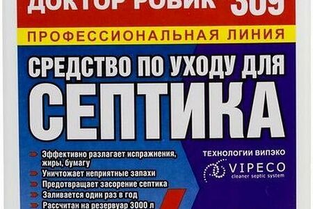 Доктор Робик 309 разработан для расщепления жиров, белков, целлюлозы, мочевины, крахмала. Простое в использовании средство устраняет неприятные запахи и засоры. Предназначено как для септического резервуара, так и для дренажа. Заливается один раз на целый год из расчета один флакон (798 мл.) на 2000 литров.