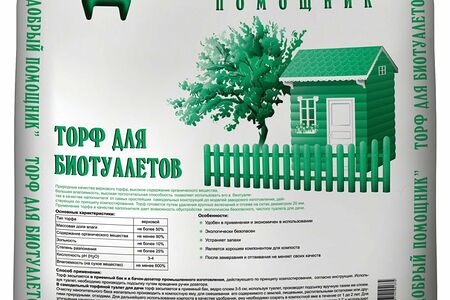 Торфяной наполнитель для биотуалетов "Добрый помощник", 50 л. Экологически безопасен, устраняет неприятные запахи, обладает высокой степенью влагопоглащения, перерабатывает отдходы в компост. Подходит для всех типов торфяных биотуалетов, действующих по принципу компостирования.