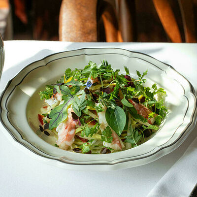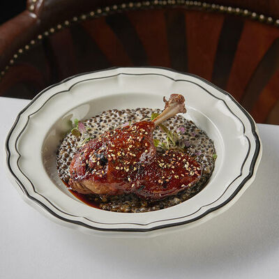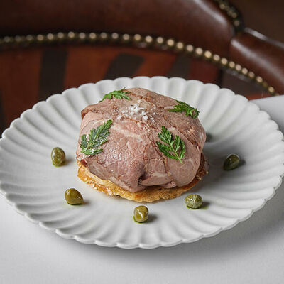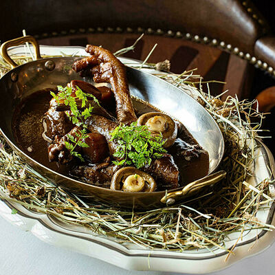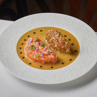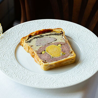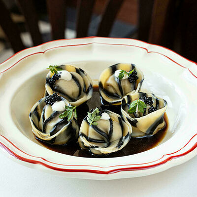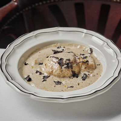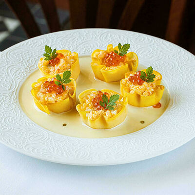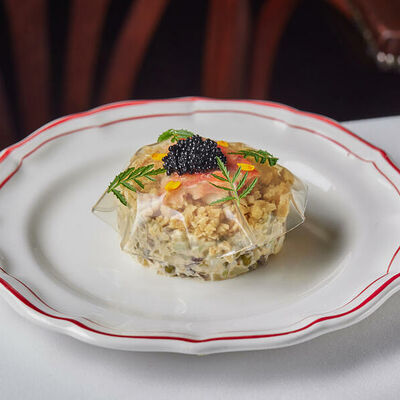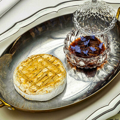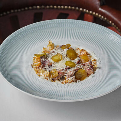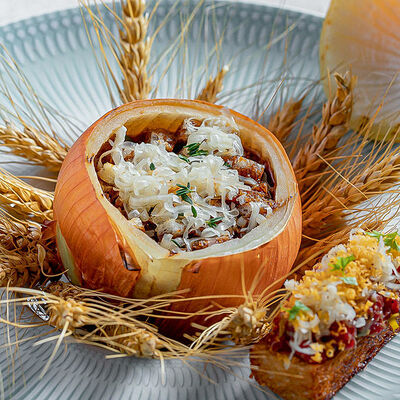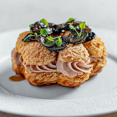 Заварное кольцо с кремом из ореха пекан, пралине из миндаля и фундука, варенье из грецкого ореха и масла из белых трюфелей