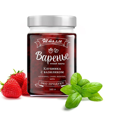 Состав: клубника с/м, сахар, базилик, мята. Срок хранения, при t 0 и 20˚c и относительной влажности 75% - 18 месяцев