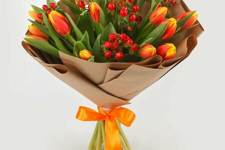 Гиперикум (5 шт.), тюльпан (15 шт.), упаковка - бумага (1 шт.)