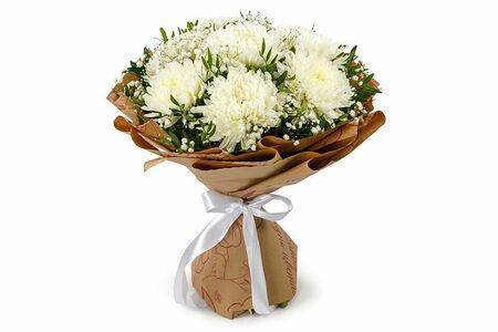 Изящный белый букет из белых хризантем, зелени фисташки и веточек гипсофилы подарит романтичное настроение и неповторимую свежесть зимнего утра