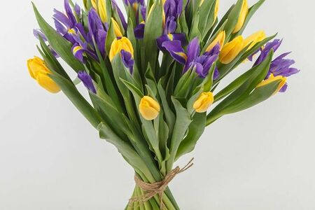 Чудесный подарок для любимой с ароматом весны - это букет из желтых тюльпанов и синих ирисов, перевязанный простым джутовым шнурком. Весенние первоцветы напомнят о ярких солнечных лучах и свежем тепло ветре в лицо