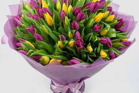 Букет 101 тюльпан Весенний фейерверк 45 см доставка