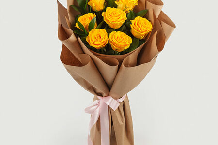 Атласная лента (1 шт.), роза микс (Россия; 7 шт.), рускус (3 шт.), упаковка (бумага; 1 шт.)