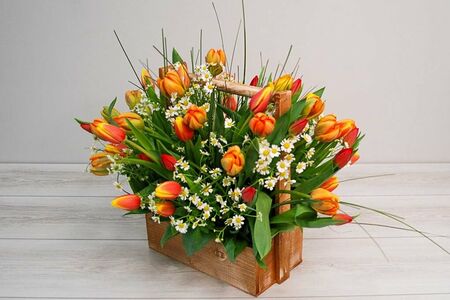 Берграсс 1 шт Кашпо "Ящик с ручкой" 1 шт Танацетум Вегмо (ромашка) 7 шт Тюльпан 51 шт