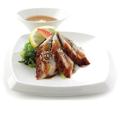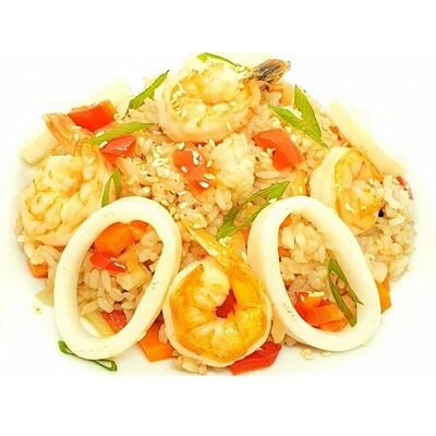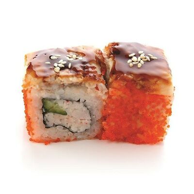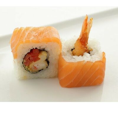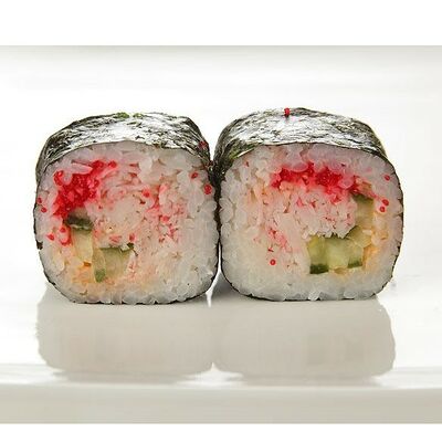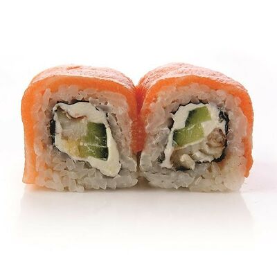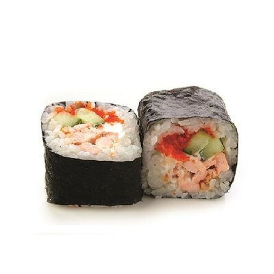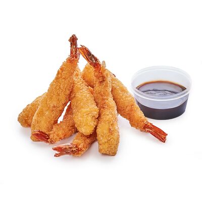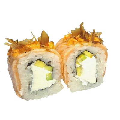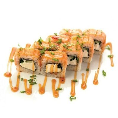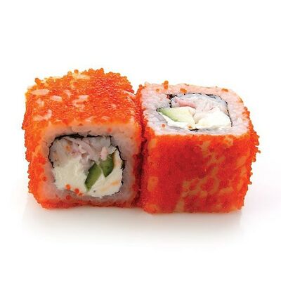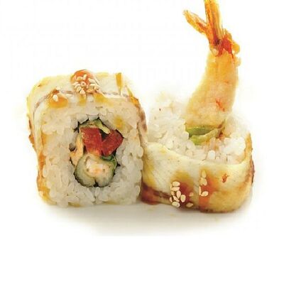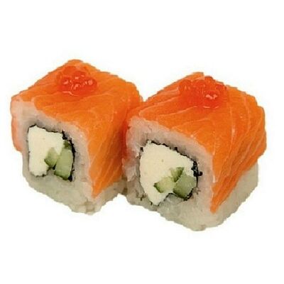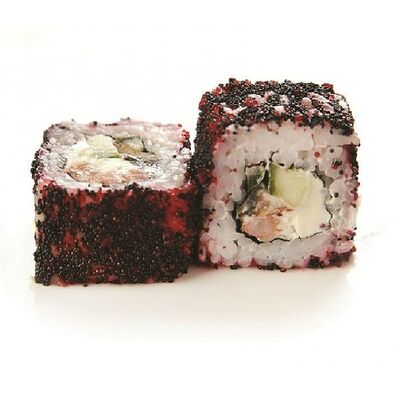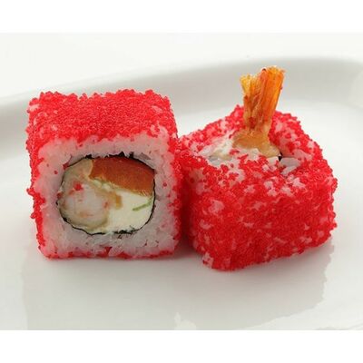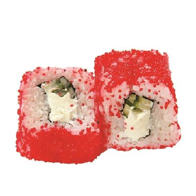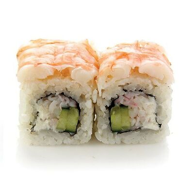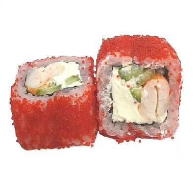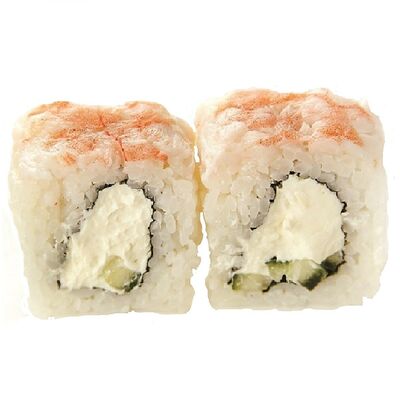 Креветки тигровые, сыр креметте, огурец, имбирь, васаби, соевый соус, палочки (8 шт.)