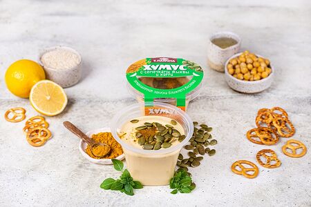 Полезная и питательная закуска, любимая на Ближнем Востоке. В основе богатый белком нут, паста из отборного кунжута, оливковое масло и сок из свежих лимонов. Кунжутная паста только собственного изготовления - все витамины и микроэлементы максимально сохранены. Хумус - идеальное блюдо для здорового питания: источник легкоусвояемого растительного белка, кладезь витаминов и микроэлементов. Подходит для веганов. Индийская приправа карри и тыквенные семечки - для экзотического вкуса и максимальной пользы.