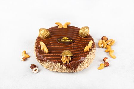 Изумительные воздушно-ореховые коржи из мелкодробленого ореха фундука, яичного белка, сахара и рисовой муки. Коржи прослоены нежным сливочным кремом от отборного сливочного масла с добавлением варёного сгущённого молока. Поверхность торта - орехово-шоколадной пастой и украшена орехами грецкий, фундук и кешью. Грецкий орех сверху прикрыт скорлупой из натурального темного шоколада. Скорлупа украшена сухим пищевым красителем «Кандурин - золото». Боковые стороны украшены лепестками миндаля. Пищевая ценность в 100 г продукта (среднее значение на 100 г продукта): белки - 6,3 г; жиры 33,1 г; углеводы — 39,5 г Энергетическая ценность: 481 ккал / 2015 кДж